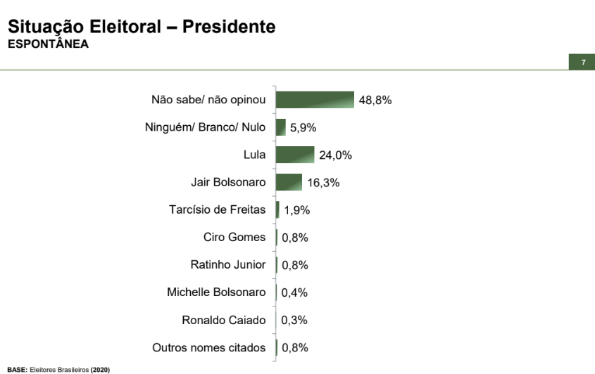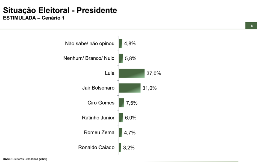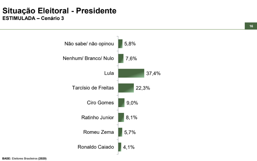 No primeiro cenário testado, além de Lula (37%) e Bolsonaro (31%), aparecem o ex-governador do Ceará, Ciro Gomes (PSB), com 7,5%; o governador de Santa Catarina, Ratinho Júnior (PSD), com 6%; o governador mineiro Romeu Zema (Novo), com 4,7%; e o governador goiano Ronaldo Caiado (União Brasil), com 3,2%. Nesta configuração, 4,8% dos entrevistados não souberam responder ou não opinaram, enquanto 5,8% indicaram que não votariam em nenhum dos nomes ou escolheriam a opção branco/nulo.
