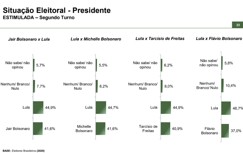 O estudo apresenta quatro configurações diferentes para o primeiro turno, nas quais o percentual de Lula varia entre 37% e 37,6%. Na simulação que inclui o ex-presidente Jair Bolsonaro, o petista registra 37% das intenções de voto, contra 31% do ex-mandatário.